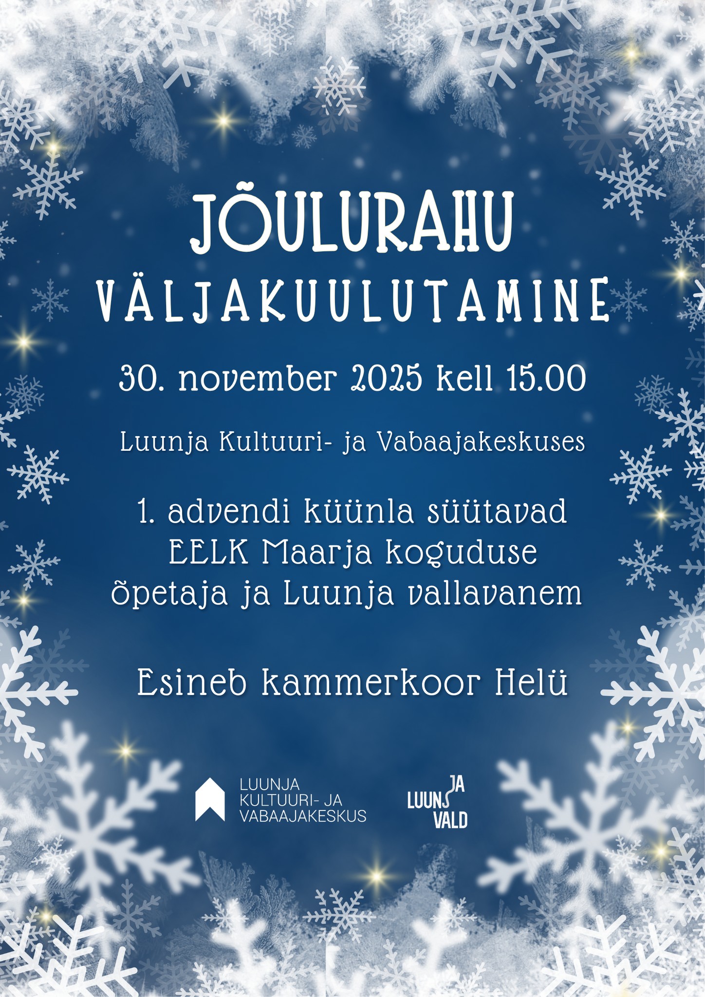 Jõulurahu kuulutatakse välja 30. novembril kell 15 Luunja Kultuuri- ja Vabaajakeskuse saalis, millele järgneb I advendi kontsert, kus esineb Kammerkoor Helü