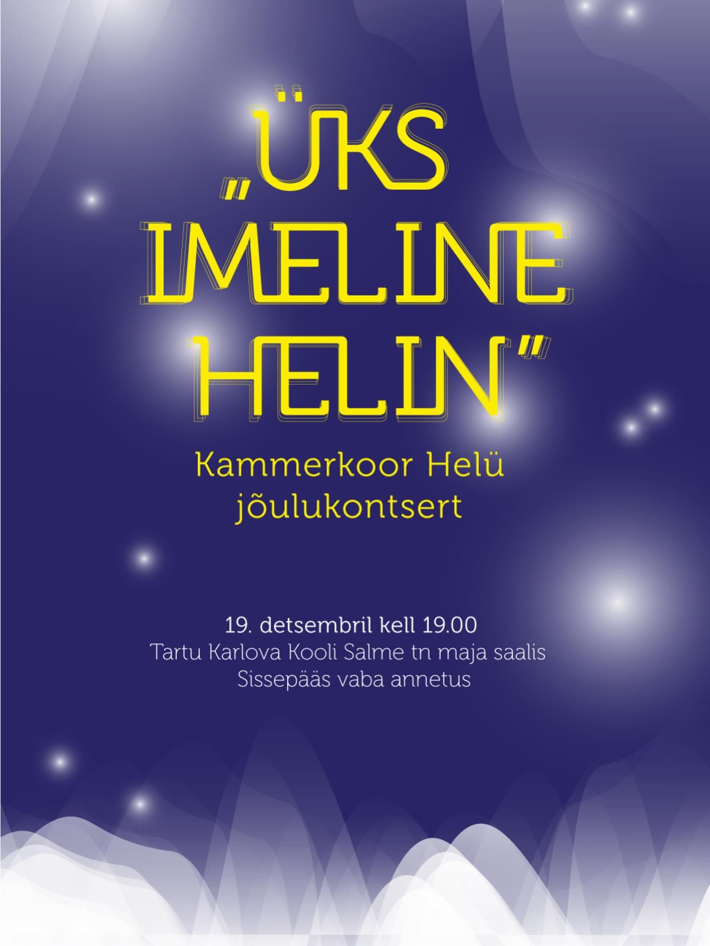 Kammerkoor Helü jõulukontsert „Üks imeline helin” kutsub sind kogema talviseid ja jõululisi helisid. Kontserdi repertuaar on pärit Eesti heliloojate sulest, kõneledes sügavuti nii ootusajast kui vaikuse ja valguse tähendusest. Lisaks Tormisele, Uusbergile, Maimetsale ja Ehalale kuulete muidugi ka klassikalisi jõuluviise.